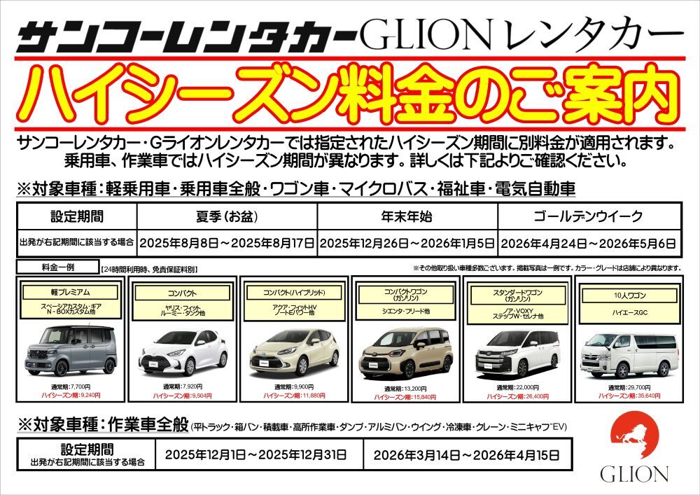 貨物車両ハイシーズン料金のお知らせ、12月1日~12月31日 期間にご出発ご予約についてはハイシーズン料金が適応となります。ご了承くださいませ。